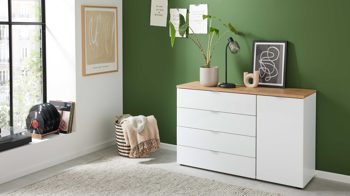 In den vier geräumigen Schubladen findet alles seinen Platz – von Unterwäsche und Socken bis hin zu Bettwäsche oder Handtüchern. Der Oberboden eignet sich perfekt für dekorative Accessoires oder deine liebsten Alltagsdinge. Mit Maßen von ca. 115 x 83 x 45 cm (BxHxT) passt die Kommode auch in kleinere Räume, ohne auf Stauraum zu verzichten. Dank Schließdämpfung und praktischem Selbsteinzug schließen die Schubladen sanft und leise. Optional kannst du die Kommode auch mit Vollauszügen ausstatten.