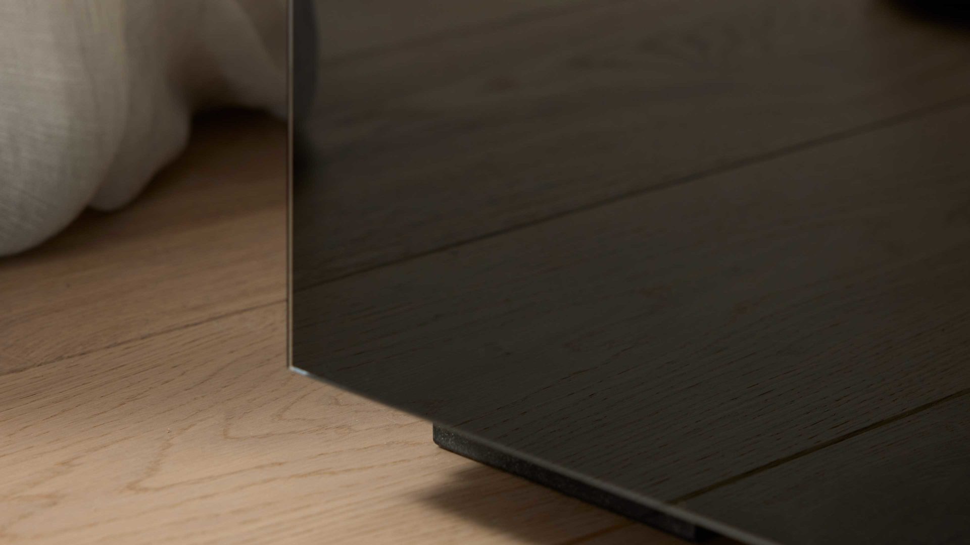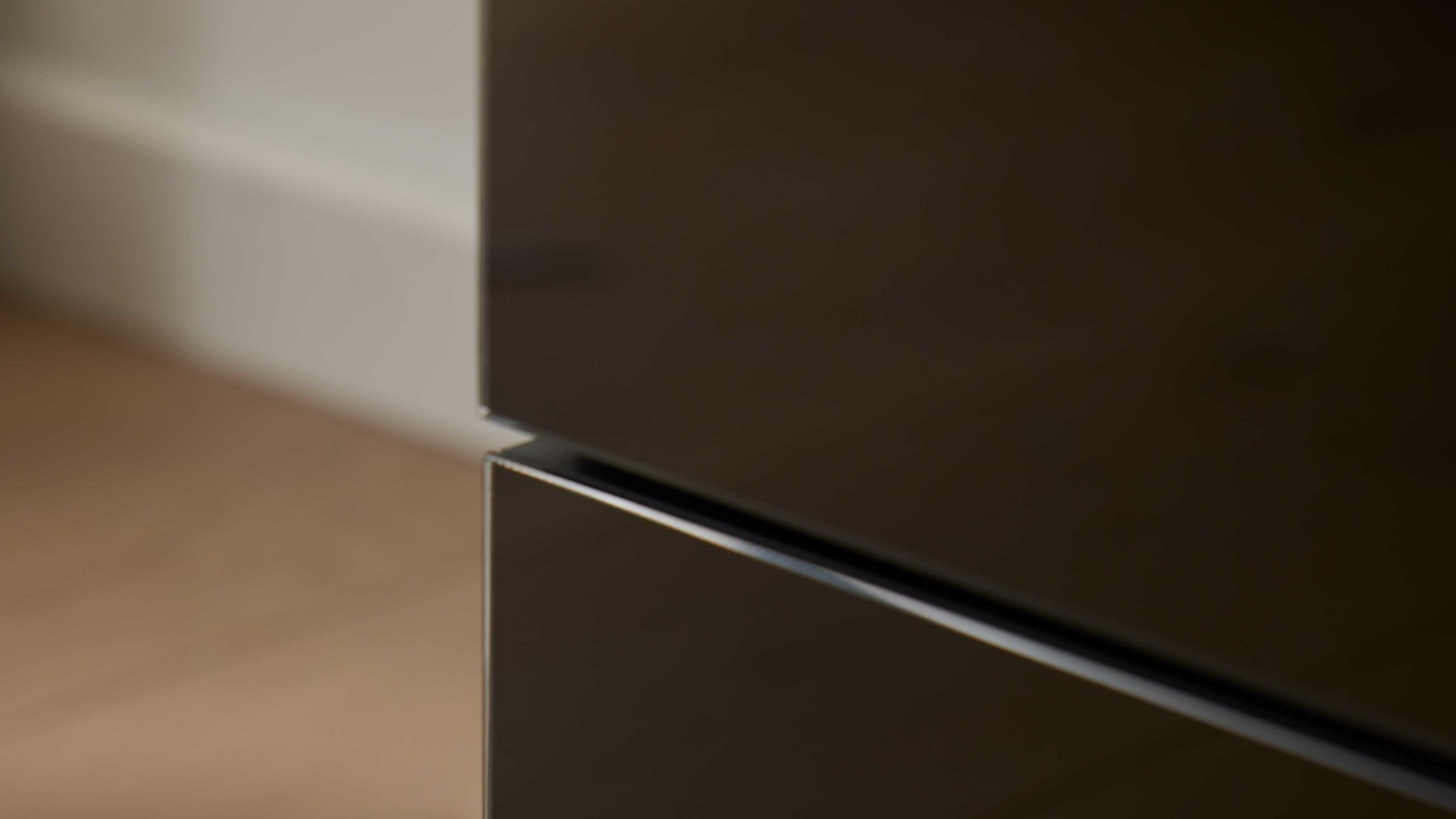 Mit ihren eleganten Schwarzglasfronten und dem edlen Oberboden in Atlantic-Eiche-Nachbildung bringt die Nachtkommode aus der Interliving Kleiderschrank Serie 1208 einen Hauch moderner Extravaganz in dein Schlafzimmer. Mattschwarze Griffleisten und die hochwertige Texline-Innenausstattung runden das harmonische Design perfekt ab.