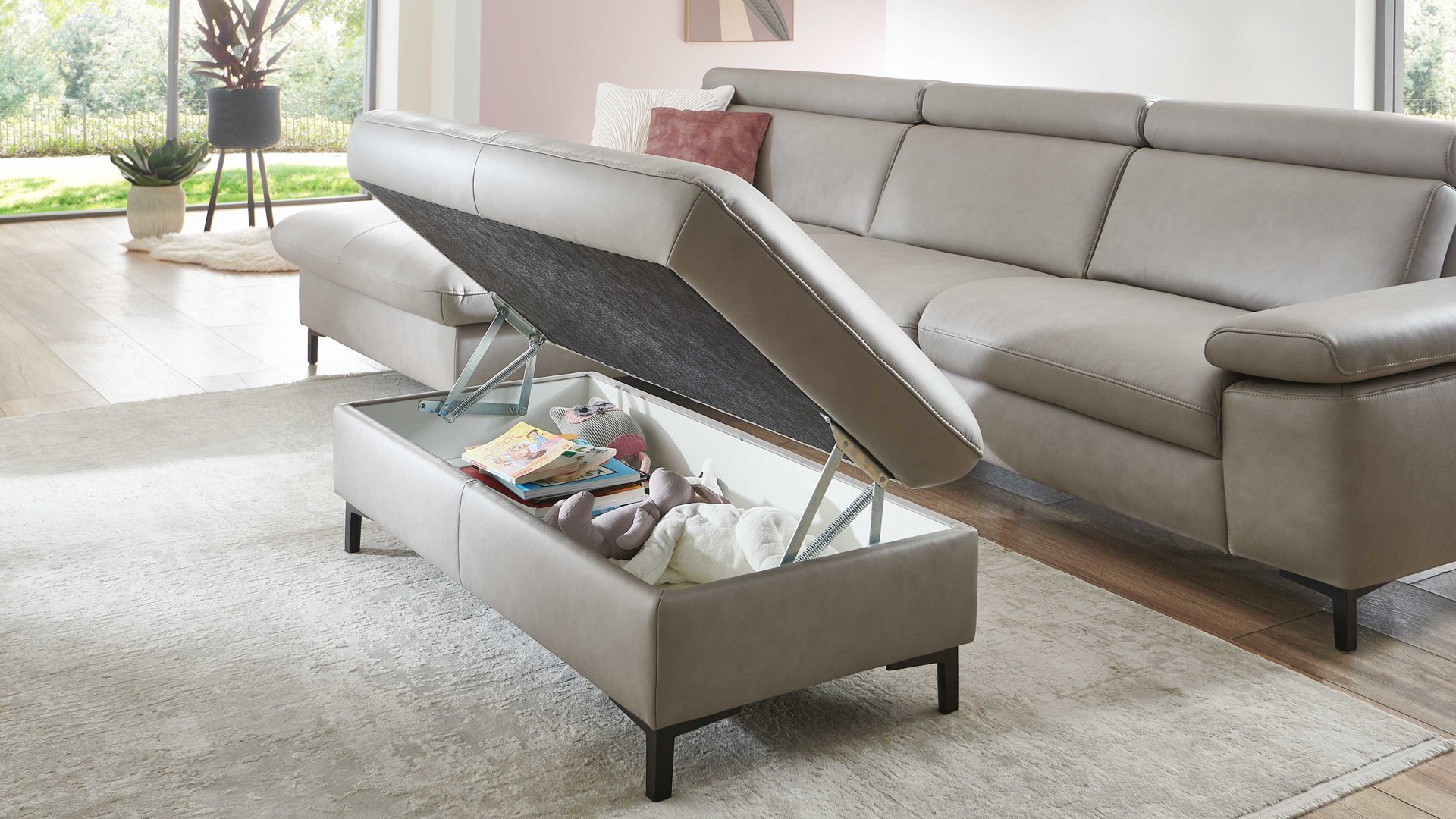 • Die Abbildung zeigt ein Wohnbeispiel, welches auch Dekoration sowie separat erhältliches Zubehör enthält. Im Lieferumfang enthalten ist eine Liegefunktion MoLi.