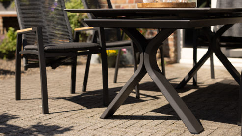 Das pulverbeschichtete Aluminiumgestell in Matt-Anthrazit ist korrosionsbeständig, UV-beständig und besonders pflegeleicht. Auch bei Regen, Sonne oder Temperaturschwankungen bleibt der Terrassentisch stabil und zuverlässig. Die Anlieferung erfolgt zerlegt, die Montage gelingt dank durchdachter Konstruktion schnell und unkompliziert.