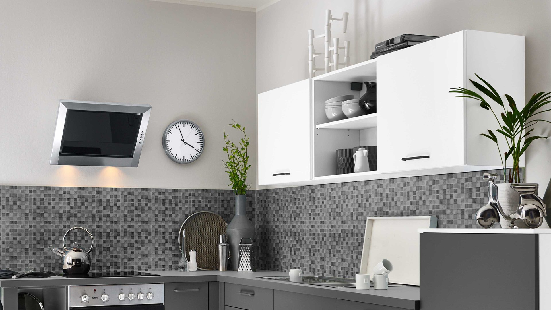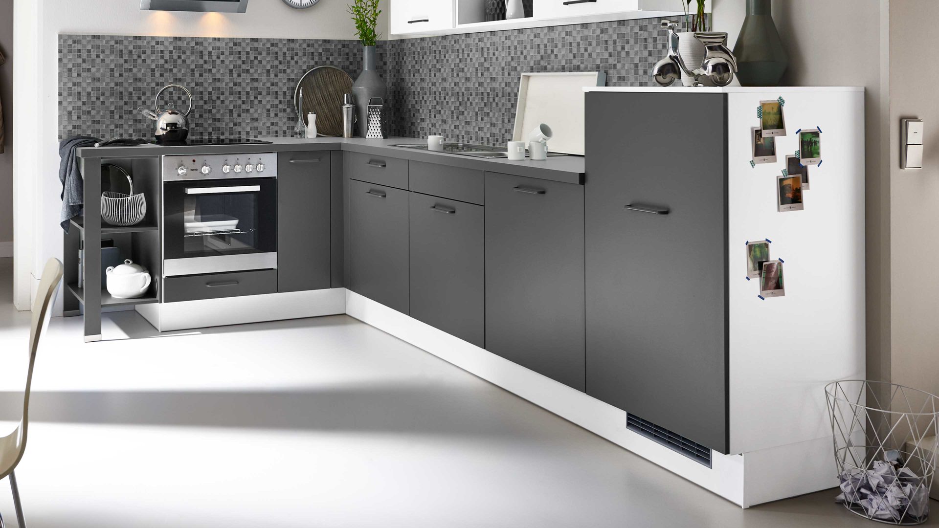 Die Fronten dieser pino Einbauküche sind vorrangig in Grafit designt, kombiniert mit puristischem Weiß. Auch die Korpusseiten und Sockelblenden präsentieren sich in Weiß. Ebenfalls weiße Arbeitsplatten mit grafitfarbenen Kanten sowie schwarze Bügelgriffe runden die modern-elegante Optik stilvoll ab.