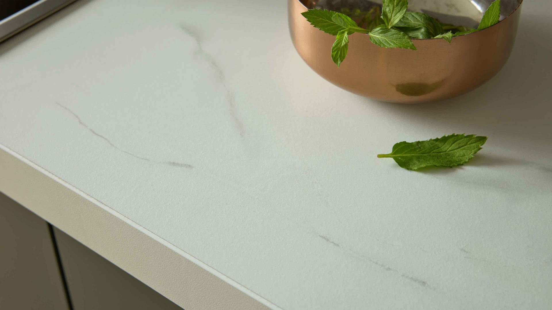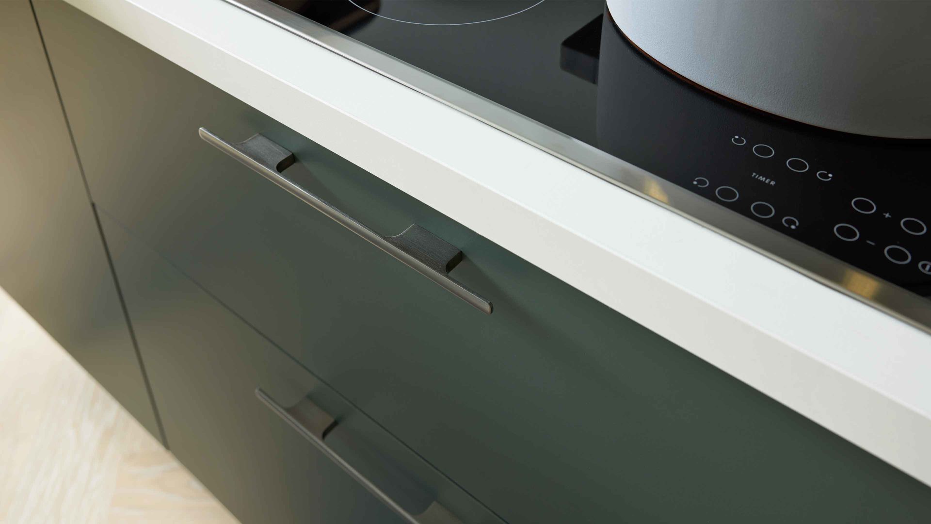 Die Interliving Küche Serie 3059 vereint matte schwarzgrüne Fronten mit einem quarzgrauen Korpus und titanfarbenen Metallgriffen. Einen besonderen Akzent setzen die Platten in weißer Marmor-Nachbildung, die der Küche eine exklusive Note verleihen. Schwarze Sockelblenden runden das modern-elegante Gesamtbild perfekt ab.