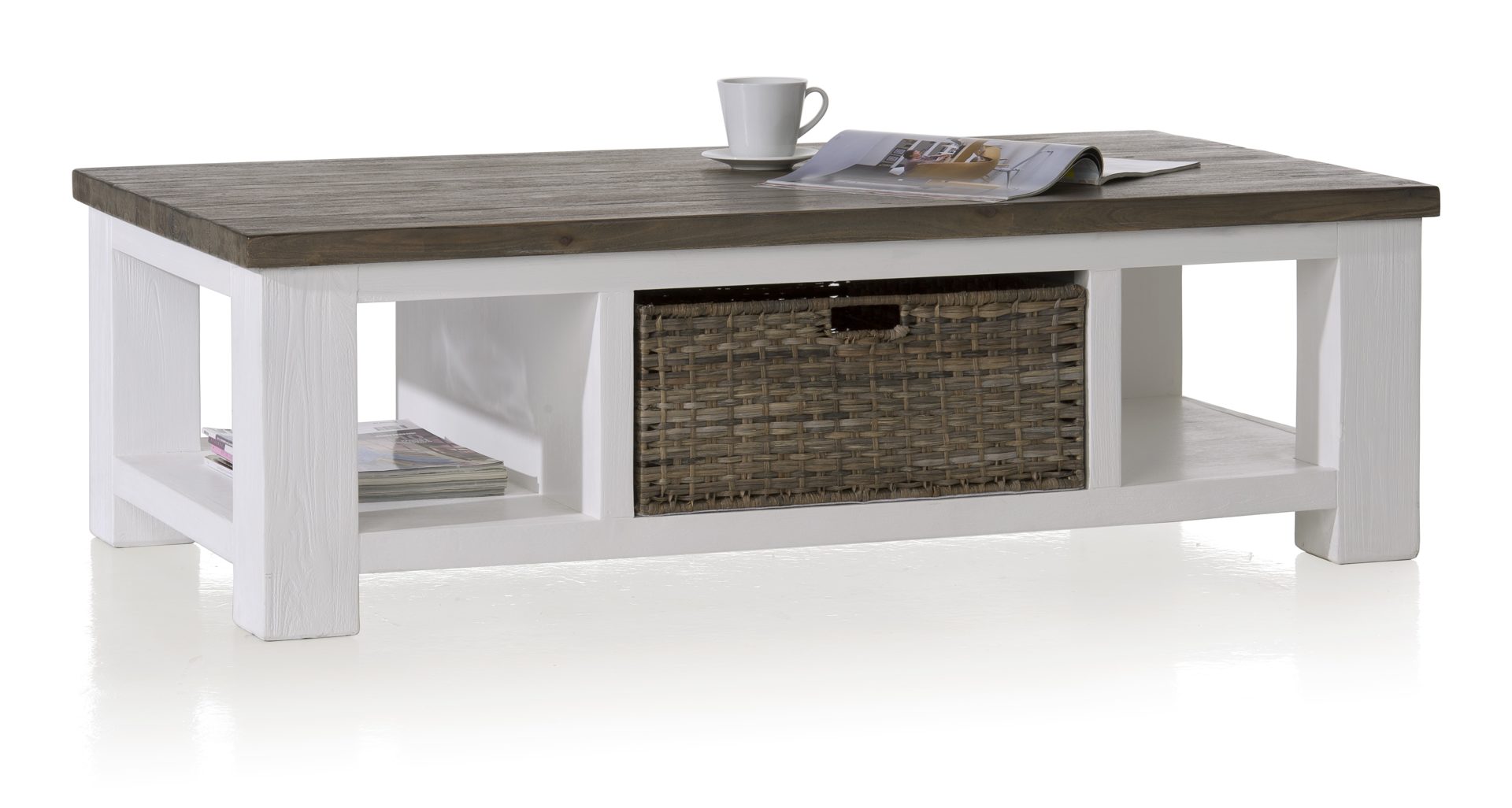 Der, aus der Deaumain-Serie stammende Couchtisch 24700WG, des holländischen Möbelherstellers Habufa spiegelt den ländlichen Charme der gesamten Serie wider. Mit dem hochwertigen Flechtkorb und jeweils einer Nische links und rechts bietet der Tisch genügend Stauraum für Zeitschriften und Dekor. Das Holz besteht aus traditionell verarbeiteter, teilmassiver, Akazie. Die Oberfläche ist glatt geschliffen und die Ecken wurden abgerundet, um dem Tisch eine moderne Ausstrahlung zu verleihen. Die natürlich entstandene Holzmaserung macht jedes Element zu einem Unikat und unterstreicht den ländlich geprägten Charakter des Tisches. Der Tisch ist in den Farben pampas grey und off white lackiert und erschafft, kombiniert mit anderen Möbeln aus der Deaumain-Reihe, ein perfekt aufeinander abgestimmtes Gesamtbild mit Wolhfühlgarantie.