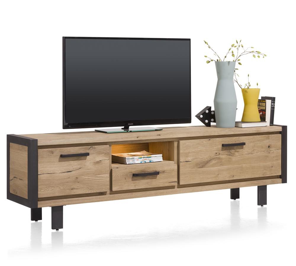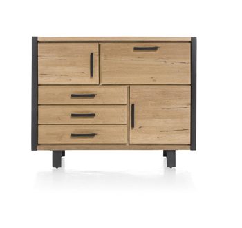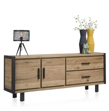Das Highboard Brooklyn 37135RWB aus dem Hause Habufa kombiniert eine moderne, handwerkliche Optik mit praktischen Stauraum. Bei der Herstellung kommen Materialien wie massive Eiche (Korpus), Eichen MDF 3D Furnier (Fronten) und Metall (Applikationen) zur Verwendung. Das Highboard ist auf Füßen gelagert, welche dem Möbelstück eine moderne Optik verleihen. Die Oberfläche ist bewusst natürlich belassen, das Holz weißt Astlöcher, Unebenheiten und Wachstumsrisse auf, die der Charakterbildung dienen und jedes Highboard Brooklyn einzigartig machen. Manche Astlöcher sind mit schwarzem Spachtel gefüllt, der optimal mit den Metallapplikationen harmoniert. Die mit LED beleuchtete Nische lädt zum Dekorieren ein, hier kommen Ihre besten Stücke perfekt zur Geltung. Die beiden Schubkästen und die drei Nischen hinter den Drehtühren bieten viel Platz zum Verstauen von Utensilien aller Art. Das Highboard wird montiert geliefert, bitte beachten Sie aufgrund der Sperrigkeit, dass es an den Verwendungsort getragen werden kann, eine Rücknahme aufgrund von Platzmangel ist leider nicht möglich.