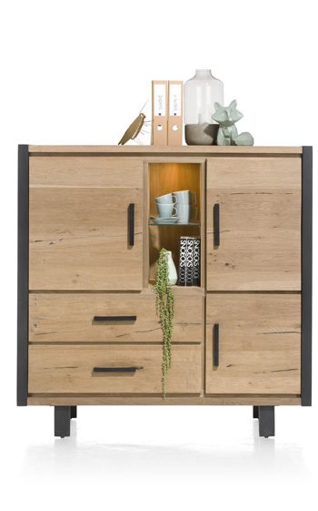Das Highboard Brooklyn 37135RWB aus dem Hause Habufa kombiniert eine moderne, handwerkliche Optik mit praktischen Stauraum. Bei der Herstellung kommen Materialien wie massive Eiche (Korpus), Eichen MDF 3D Furnier (Fronten) und Metall (Applikationen) zur Verwendung. Das Highboard ist auf Füßen gelagert, welche dem Möbelstück eine moderne Optik verleihen. Die Oberfläche ist bewusst natürlich belassen, das Holz weißt Astlöcher, Unebenheiten und Wachstumsrisse auf, die der Charakterbildung dienen und jedes Highboard Brooklyn einzigartig machen. Manche Astlöcher sind mit schwarzem Spachtel gefüllt, der optimal mit den Metallapplikationen harmoniert. Die mit LED beleuchtete Nische lädt zum Dekorieren ein, hier kommen Ihre besten Stücke perfekt zur Geltung. Die beiden Schubkästen und die drei Nischen hinter den Drehtühren bieten viel Platz zum Verstauen von Utensilien aller Art. Das Highboard wird montiert geliefert, bitte beachten Sie aufgrund der Sperrigkeit, dass es an den Verwendungsort getragen werden kann, eine Rücknahme aufgrund von Platzmangel ist leider nicht möglich.