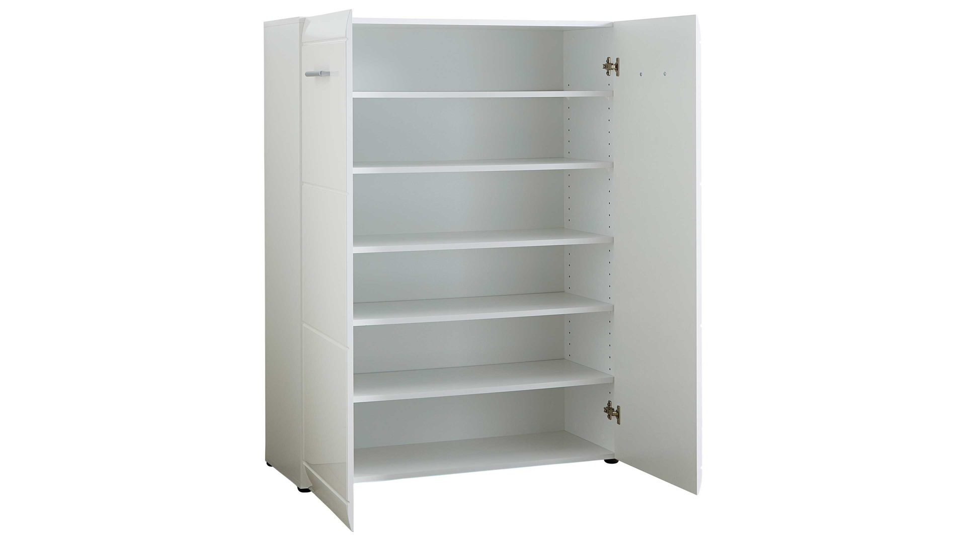 Verstauen Sie Ihre Schuhe staubfrei und ordentlich in diesem praktischen Schuhschrank in strahlendem Weiß. In Ihrer Diele sorgt diese Art der Schuhaufbewahrung jederzeit für Ordnung, denn Sie bietet ausreichend Platz für etwa 20 Paar Schuhe, die Sie dadurch stets griffbereit haben. Bringen Sie Ihre Sandalen, Sneaker oder Halbschuhe in diesem formschönen und zeitlosen Schuhschrank unter, der über eine Doppeltür und fünf Einlegebögen verfügt und damit wunderbar unkompliziert in der Handhabung ist.