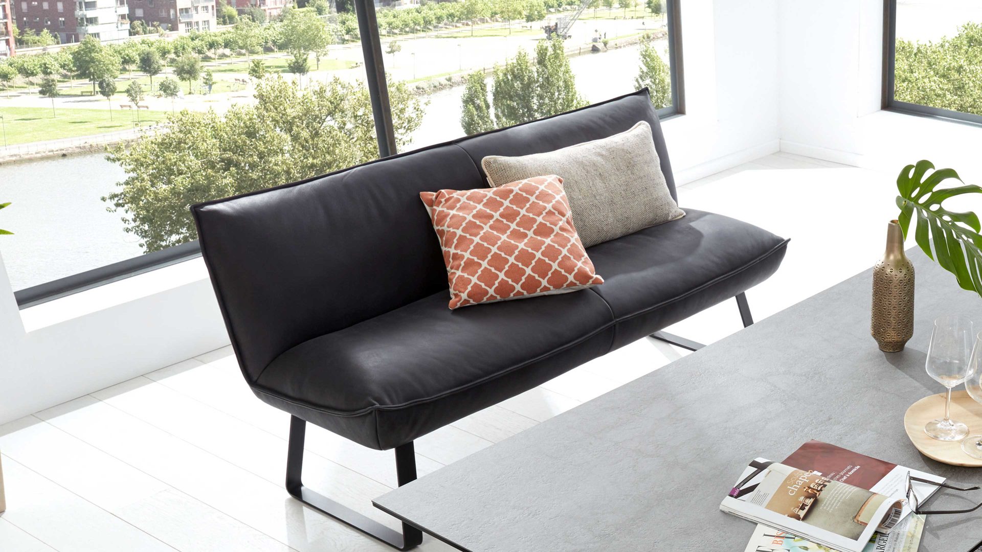 Als Basis fungiert ein mattschwarz pulverbeschichtetes Flachkufengestell mit Struktur. Die Sitz- und Rückenfläche der qualitativ hochwertigen Dinerbank sind mit dunklem Leder bezogen, das extravagante Tiefgründigkeit und jede Menge Gemütlichkeit ausstrahlt. Neben den optischen Höhepunkten bietet die Lederbank auch funktionale Highlights. Dank der legeren Schaumpolsterung mit extra weicher, softer Oberfläche genießen Sie besonders hohen Sitzkomfort.