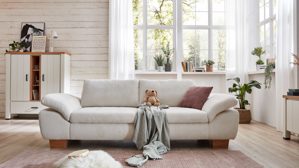 • Die Abbildung zeigt ein Wohnbeispiel, welches auch Dekoration sowie separat erhältliches Zubehör enthält. Im Lieferumfang enthalten ist ein Schlafsofa Patti mit Holzfüßen und -blenden.
