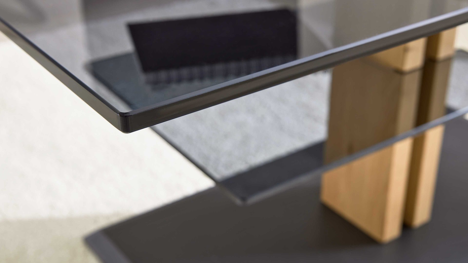 Die beiden 10 mm starken ESG-Glasplatten sind von einem lackierten Metallrahmen eingefasst und strahlen stilvolle Leichtigkeit aus. Die anthrazit-metallicfarben lackierten Metallelemente und die stabile MDF-Bodenplatte setzen kontrastreiche Akzente und verleihen dem Tisch seine moderne, elegante Wirkung.