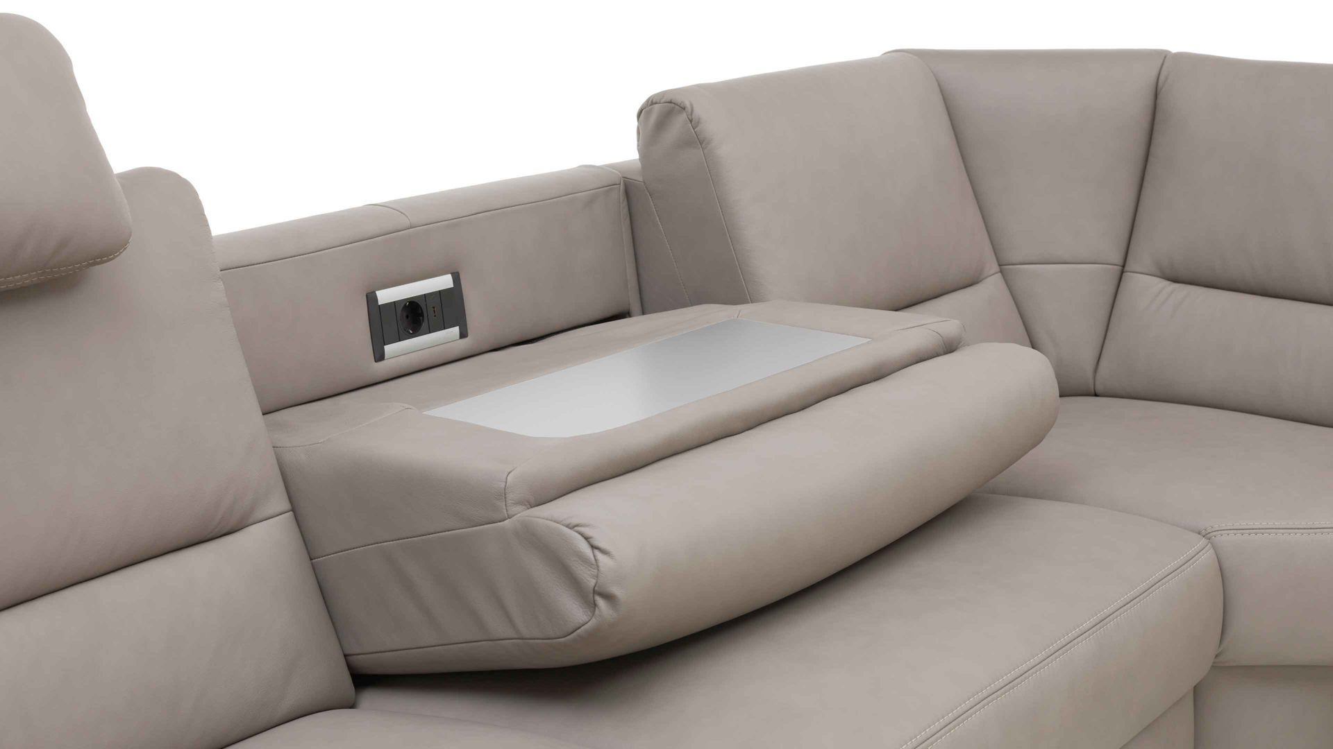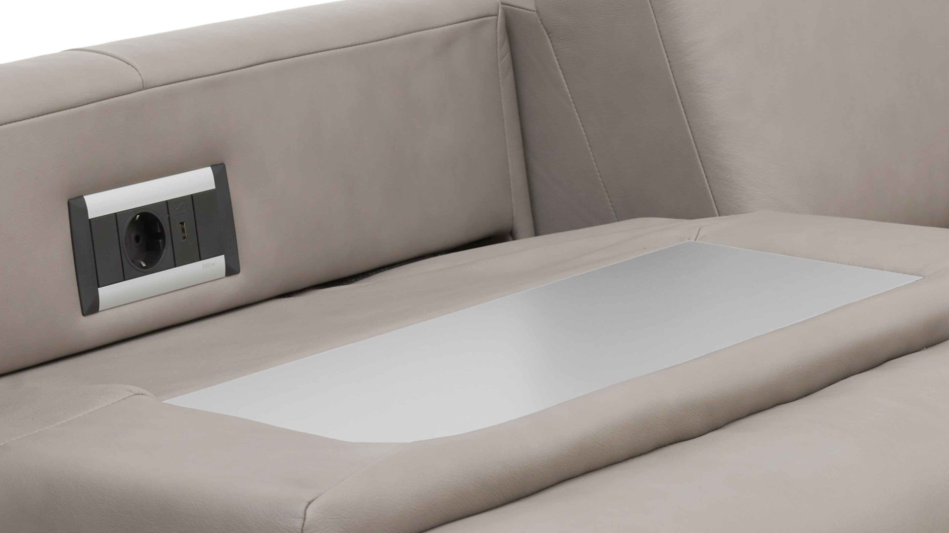 Besonders vorteilhaft sind die integrierte Steckdose und der USB-Anschluss. Diese Extras ermöglichen Ihnen beispielsweise das Aufladen Ihres Smartphones oder Notebooks, während Sie auf dem Sofa sitzend arbeiten oder relaxen. Die Farbe der Ablage entspricht stets der Fußfarbe des jeweiligen Polstermöbels.