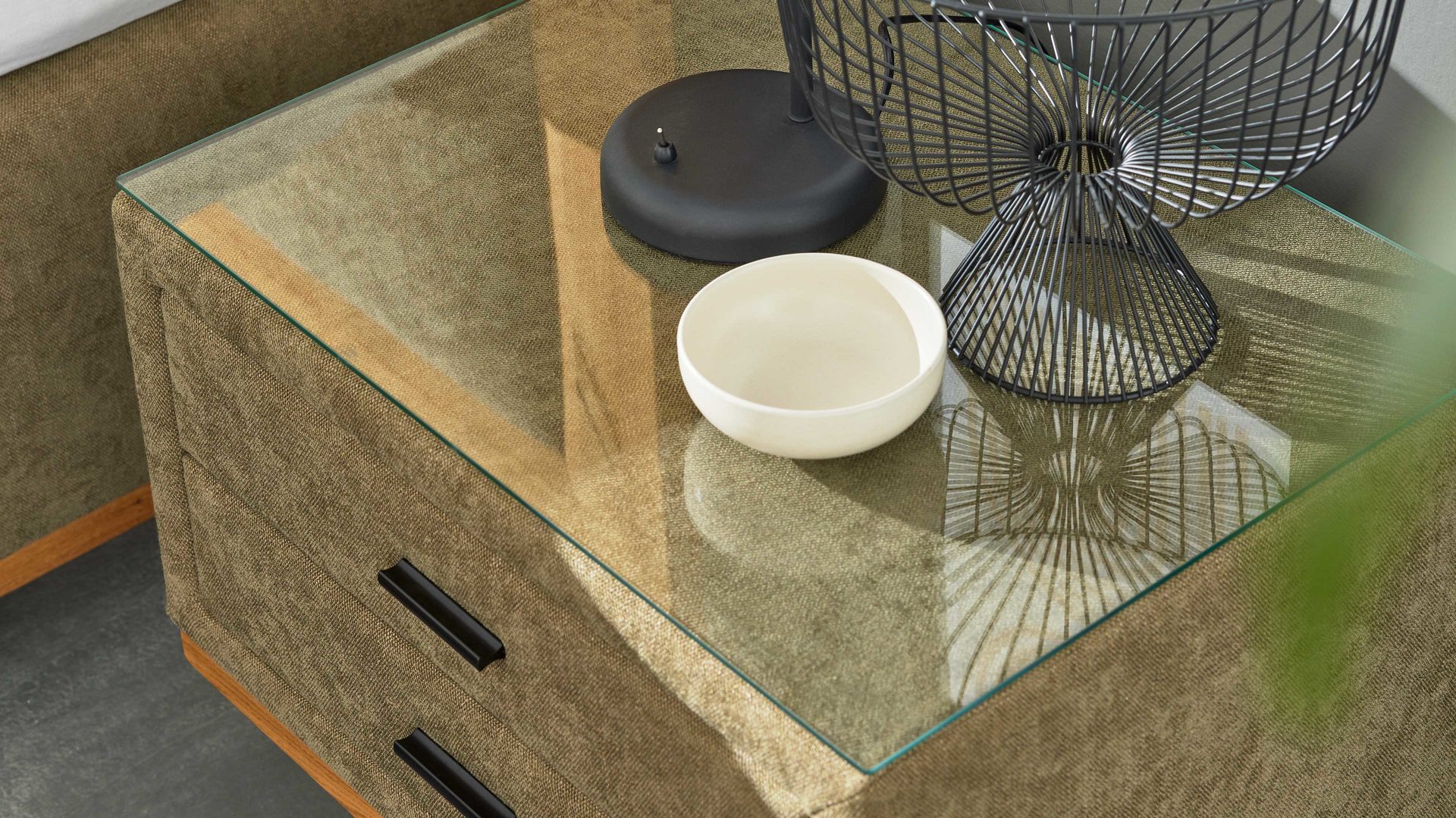 Die Interliving Nachtkommode Serie 1415 ergänzt dein Schlafzimmer perfekt – mit ihrem modernen olivgrünen Stoffbezug, der naturfarben geölten Wildeiche und feinen Akzenten aus schwarzem Metall bringt sie Design, Funktion und Natürlichkeit in Einklang.