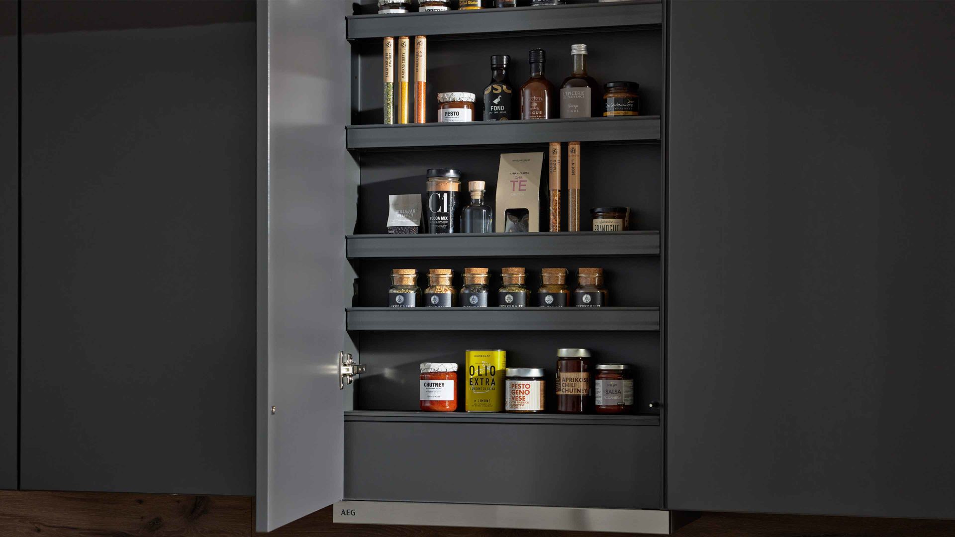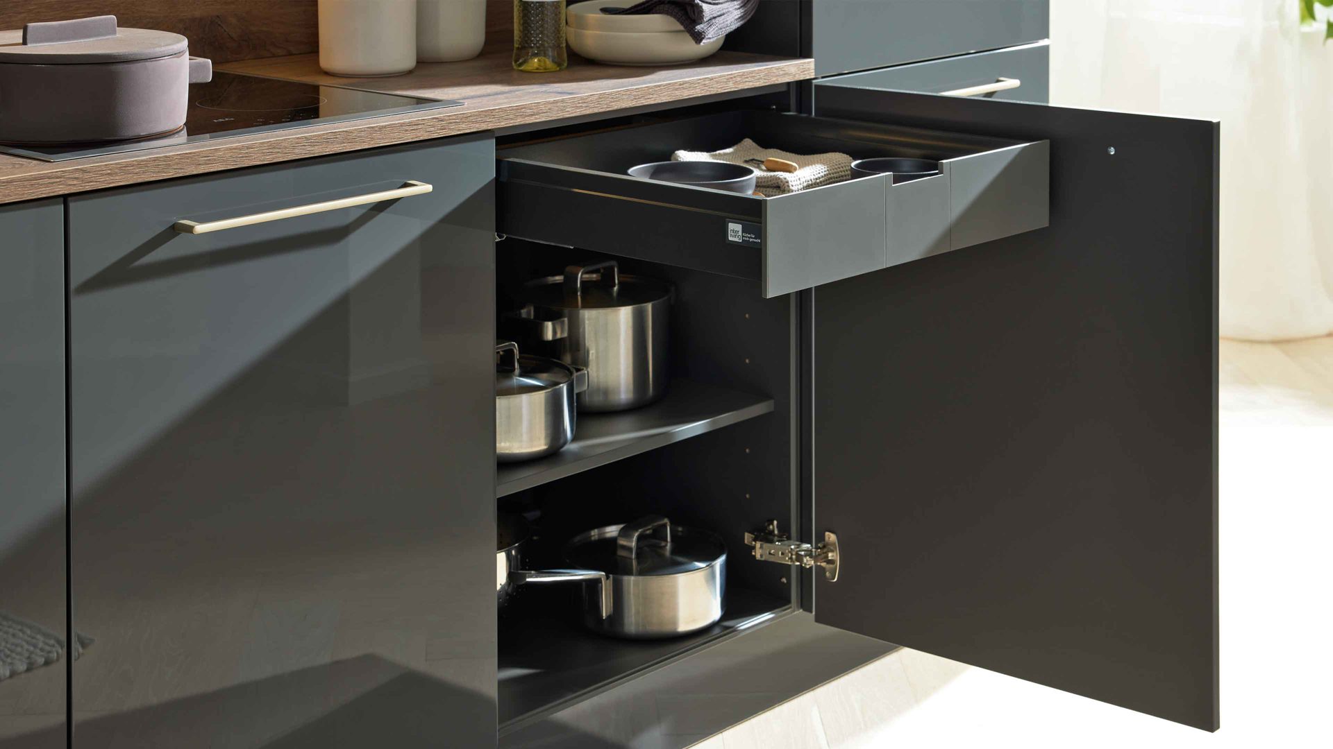 Interliving Küche Serie 3061 – moderne Hochglanzküche in Graphit mit AEG-Einbaugeräten