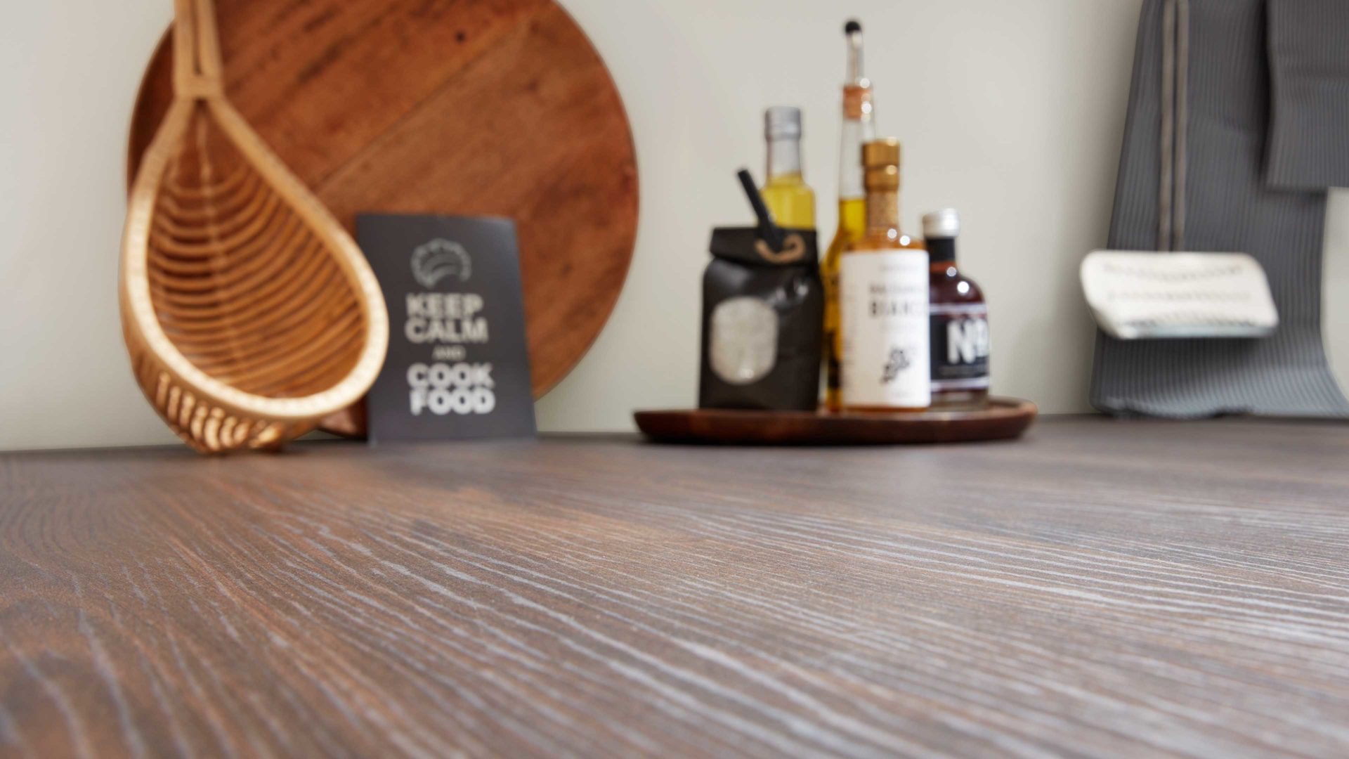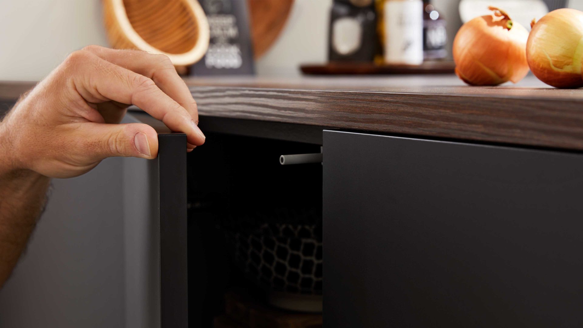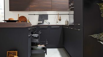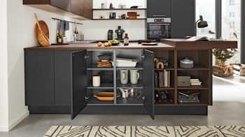 Die Interliving Küche Serie 3031 verbindet moderne Eleganz mit natürlicher Wärme. Softmatte schwarze Fronten treffen auf die freundliche Ausstrahlung der Kuba Nussbaum-Nachbildung. Korpus und Sockelblenden erscheinen in edlem Schwarz, während Arbeits- und Thekenplatten mit Dickkante sowie offene Regalelemente den warmen Holzton aufgreifen. So entsteht ein spannender Kontrast, der der Küche Tiefe und Persönlichkeit verleiht.