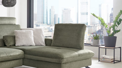 Des Weiteren können Sie einige Details an Ihre Wünsche und Bedürfnisse anpassen. Die Polstermöbel sind preisgleich mit einer soften Kaltschaum- oder etwas festeren Federkernpolsterung sowie mit mattschwarzen oder glänzenden Metallfüßen erhältlich. Darüber hinaus profitieren Sie von der umfangreichen Bezugauswahl. Es sind verschiedene Zusammenstellungen planbar, die sich mit vielen Funktionen ergänzen lassen.