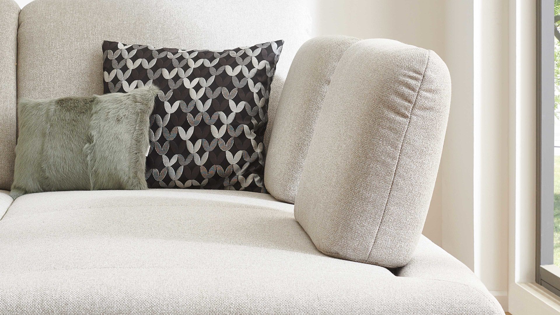 • Die Abbildung zeigt ein Wohnbeispiel, welches auch Dekoration sowie separat erhältliches Zubehör enthält. Im Lieferumfang enthalten ist ein Ecksofa mit Sitztiefen- und Armlehnverstellung.
