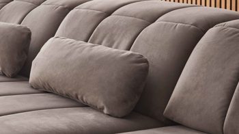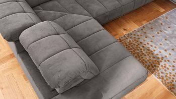 grauer Stoffbezug in Samtoptik und mattschwarze Metall-Winkelfüße
