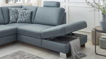 Beweisen Sie Geschmack und stellen Sie die Polsterecke, die auch mit Federkernpolsterung sowie gegen Mehrpreis mit vielen Funktionen und Ergänzungen erhältlich ist, prominent in Ihren Wohnbereich. Individuelle Anpassungen ermöglichen der große Typenplan und die große Bezugauswahl.