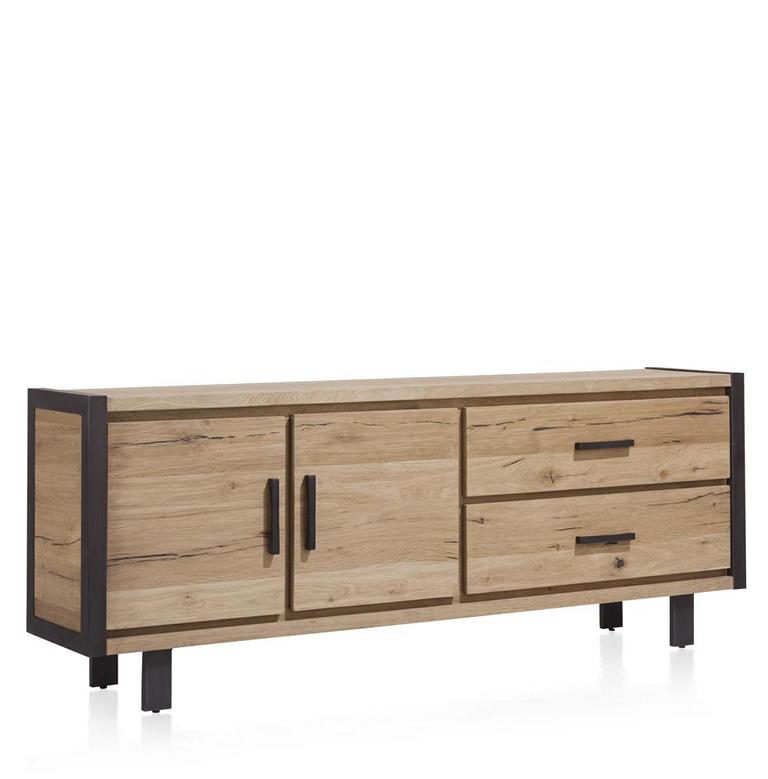 Das Sideboard Brooklyn 37136RWB von Habufa wird aus massiver Eiche und 3D Eichenfurnier (MDF) gefertigt. Die Oberfläche ist bewusst natürlich belassen, um dem Sideboard ein natürlichen und handwerklichen Charakter zu verleihen. Dazu dienen Astlöcher, Wachstumsrisse und Unebenheiten im Holz. Manche Astlöcher werden mit schwarzem Spachtel gefüllt, der optimal mit den Metallapplikationen in der Front harmoniert und dem Möbelstück einen used Look verleiht. Für eine moderne Optik sorgen die vier Metallfüße, auf dem das Sideboard Brooklyn von Habufa gelagert ist. Mit einer Breite von ca. 210 cm, den beiden Schubkästen und die große Nische hinter den Drehtüren, bietet es viel Platz zum Verstauen. Das Möbelstück wird montiert geliefert und besitzt eine hohe Sperrigkeit, bitte sorgen Sie dafür, dass es zu seinem Verwendungsort getragen werden kann.