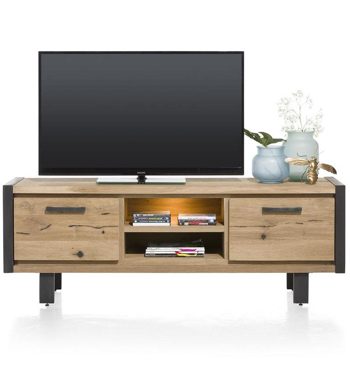 Das Brooklyn Lowboard 37137RWB von Habufa bietet mit seiner Breite von ca. 170 cm viel Platz für Ihren Fernseher. In den beiden offenen Nischen können Sie zusätzlich Bluerayplayer, Reciever etc. verstauen. Dank der internen Kabeldurchlässe entsteht kein sichtbarer Kabelsalat, der den Anblick des Lowboards trüben könnte. Die Nischen habe eine Größe von B/H/T: ca. 50 x 13,2 x 4036 cm. Zusätzliche Utensilien können in den beiden Nischen hinter den Türen verstauen. Das Lowboard Brooklyn besticht durch seine natürliche Optik und Haptik. Bei der Herstellung wir aus massives Eichenholz (Korpus) und MDF 3D Furnier gesetzt (Fronten). Die Oberflächen des Holzes bleiben dabei größtenteils unbearbeitet, um den ursprünglichen und handwerklichen Charakter zu formen. Astlöcher, Unebenheiten und Wachstumsrisse sind Teil dieser Optik und bewusst gelassen. Manche Astlöcher werden mit schwarzem Spachtel gefüllt, der optimal mit den Metallapplikationen harmoniert. Ein besonderes Highlight ist die mit LED beleuchtete Nische.