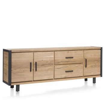 Das Sideboard Habufa Brooklyn 37154RWB ist mit seiner Breite von ca. 240 cm ein echtes Platzwunder. Die beiden Schubkästen und die großen Fächer hinter den Drehtüren bieten Platz für allerlei Utensilien. Das Sideboard wird komplett aus massiver Eiche (Korpus), MDF 3D Dickfurnier (Fronten) und Metallapplikationen hergestellt. Um den Möbelstücken der Brooklyn Reihe ein besonders natürliches Äußeres zu verleihen, sind alle Holzoberflächen weitgehend naturbelassen. Astlöcher, Wachstumsrisse und Unebenheiten sind gewollt und machen jedes Sideboard der Serie zu einem echten Unikat. Manche Stellen sind mit schwarzem Kit gespachtelt, welches optimal mit dem Metall harmoniert. Das Sideboard wird montiert geliefert, aufgrund seiner Größe ist das Sideboard Brooklyn von Habufa sperrig. Bitte vergewissern Sie sich, dass das Möbelstück an den Verwendungsort getragen werden kann.