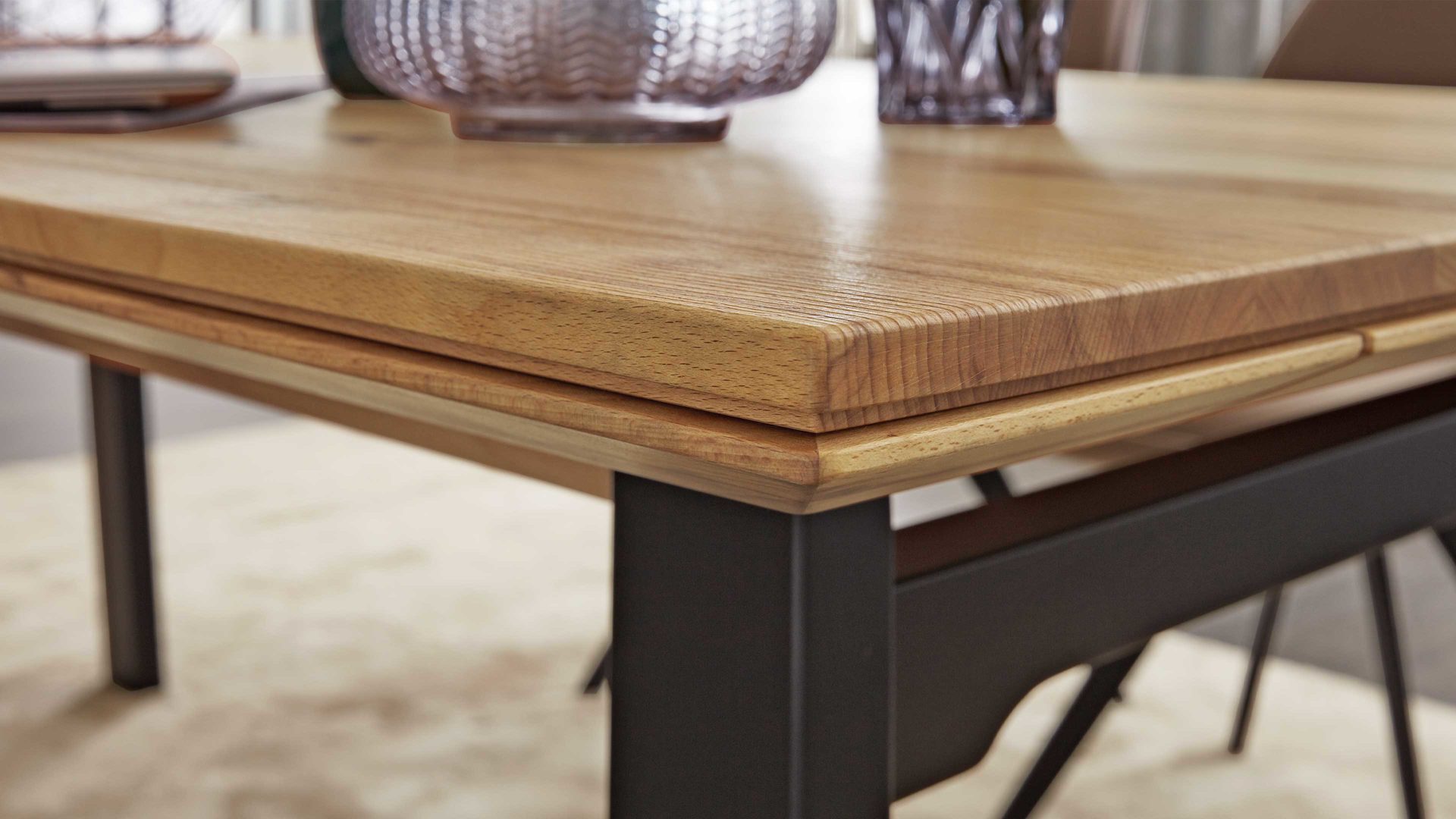 Das Vierfußgestell aus mattschwarzem Eisen verleiht dem Tisch eine moderne, klare Optik und sorgt gleichzeitig für hohe Stabilität. Der spannende Materialmix aus Massivholz und Metall macht den Tisch zum Blickfang in jedem Esszimmer.