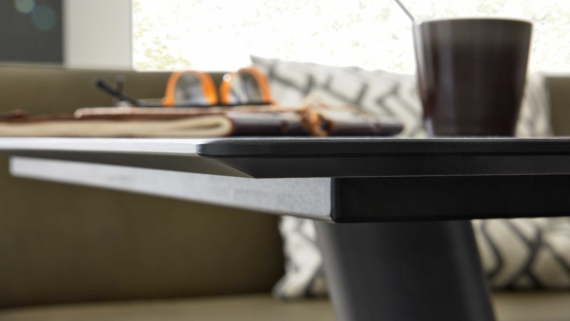 Die Tischplatte besteht aus HPL (High Pressure Laminate) – einem Hochdrucklaminat mit Melaminharz-Oberfläche, das für seine besondere Widerstandsfähigkeit bekannt ist. Mit einer Plattenstärke von ca. 13 mm wirkt sie elegant schlank und modern, während die Facettenkante für ein feines, hochwertiges Finish sorgt. HPL ist ein äußerst strapazierfähiges Material, das im Alltag überzeugt. Es ist kratz- und stoßfest, lichtecht, säurebeständig und wetterfest – perfekt, wenn du einen Esstisch suchst, der nicht nur gut aussieht, sondern auch einiges aushält.