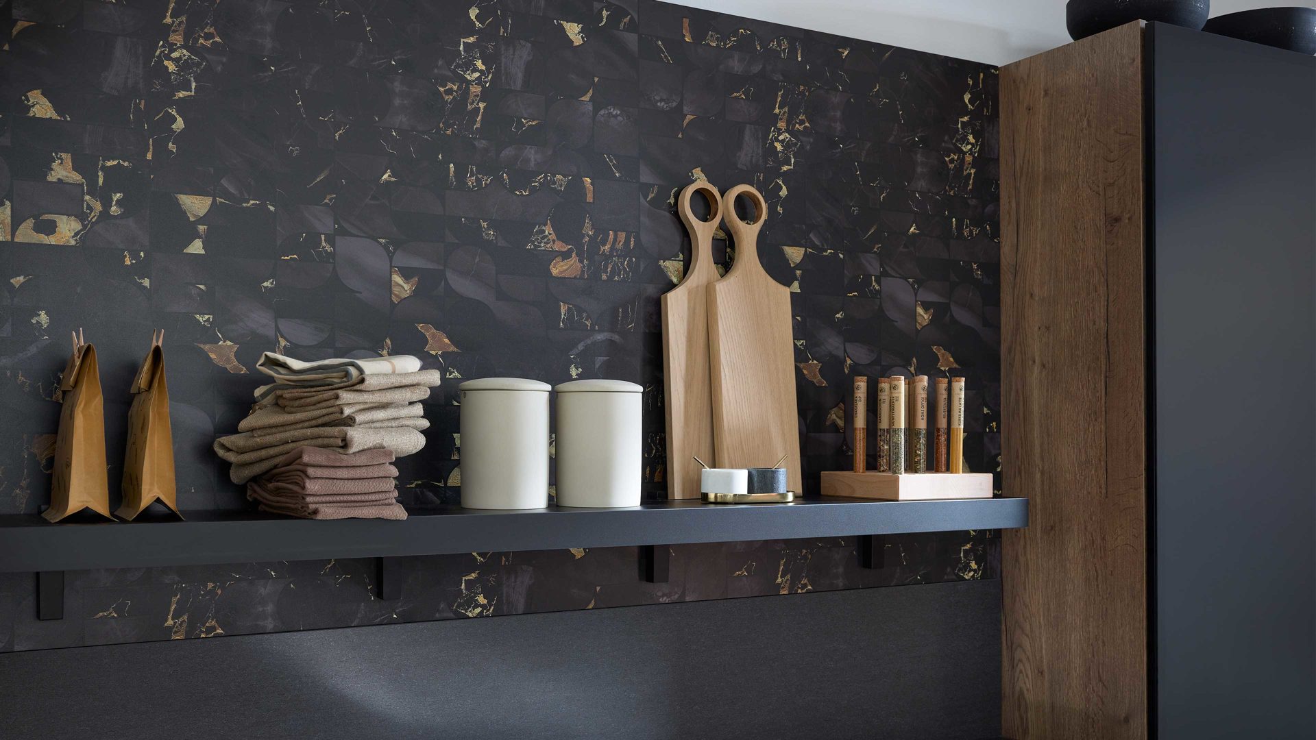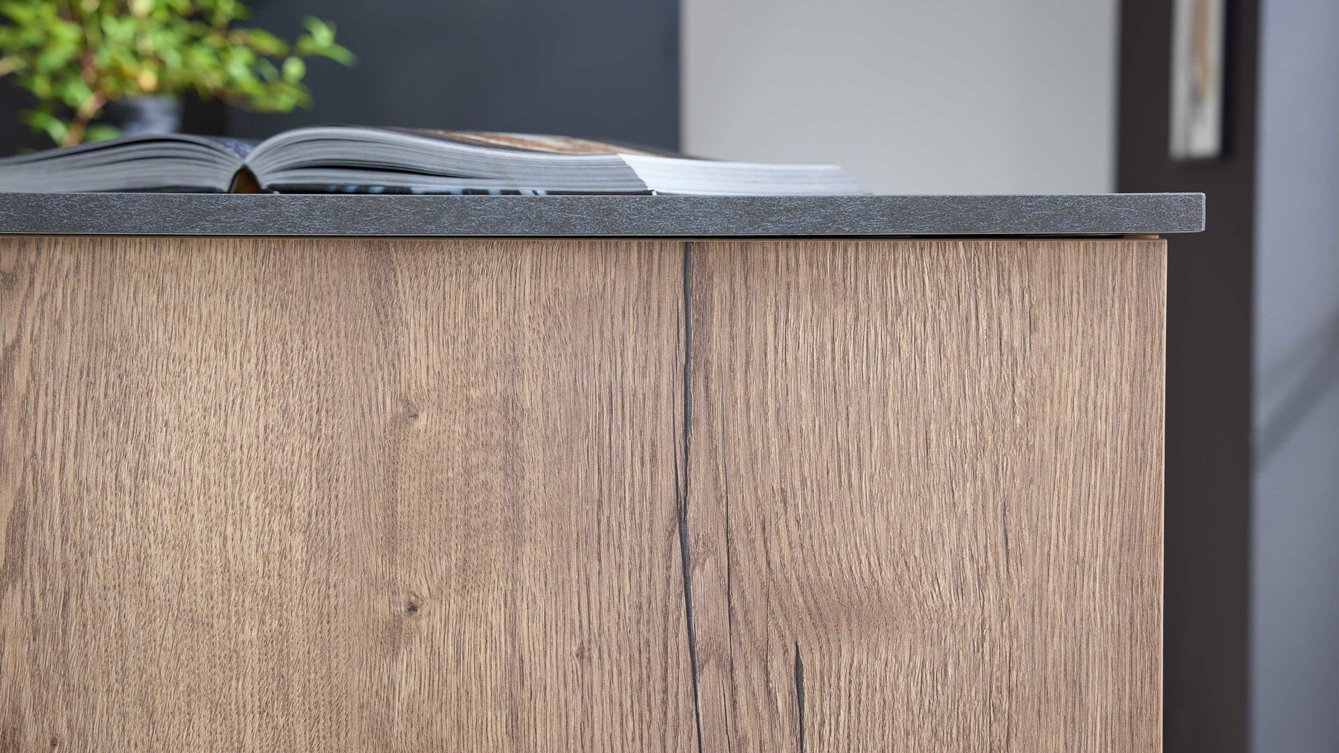 Die Culineo® Einbauküche C382 überzeugt durch eine edle Kombination aus natürlichen Holztönen und modernen Glasakzenten. Fronten in Eiche Havanna-Nachbildung, kombiniert mit mattschwarzem Glas in schwarzen Aluminiumrahmen und eleganten schwarzen Griffleisten, schaffen ein luxuriöses, zeitloses Design. Die Nischenverkleidung im Dekor Golden Art setzt stilvolle Akzente, während die Arbeitsplatten im Dekor Evora Ceramic Rocher Noir mit ihrer feinen Steinstruktur den hochwertigen Charakter der Küche unterstreichen. Abgerundet wird das harmonische Gesamtbild durch Sockelblenden in Eiche Havanna-Nachbildung und einen grauschieferfarbenen Ansetztisch, der zusätzlichen Platz zum Essen, Arbeiten oder gemeinsamen Kochen bietet.