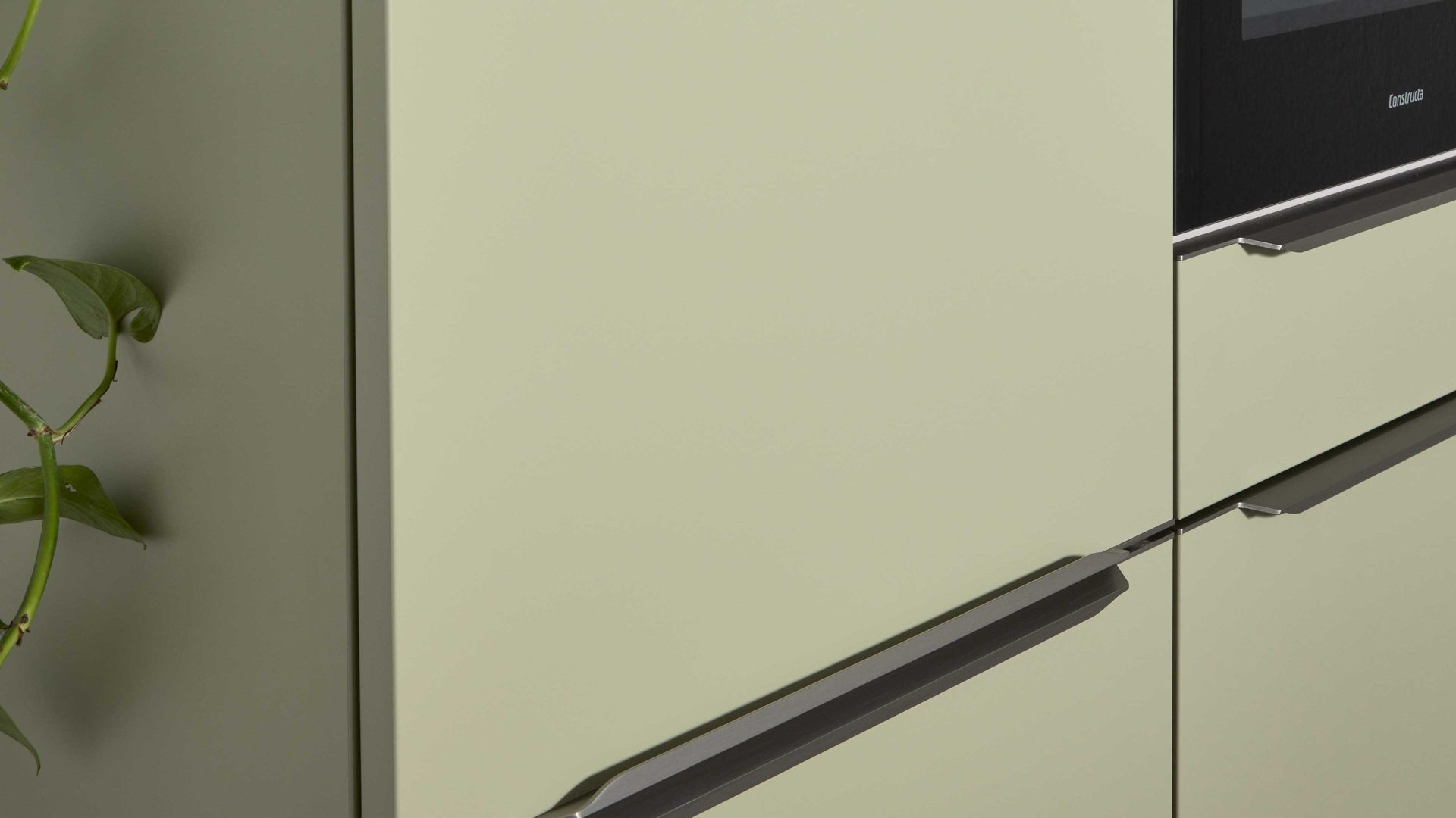 Die Interliving Küche Serie 3071 verbindet softmattes Arcticweiß mit dem frischen Farbton Avocado und schafft so eine besonders moderne, einladende Atmosphäre. Für einen harmonischen Kontrast sorgen Arbeitsplatten, Nischenverkleidung und die angesetzte Theke in graphitsilberfarbener Eiche-Nachbildung, die dem Design eine warme, natürliche Note verleihen.
