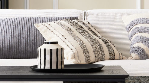 Kissenbezug mit eingenähten schwarzen Wollfäden, unifarbener Rückseite und verdecktem Reißverschluss