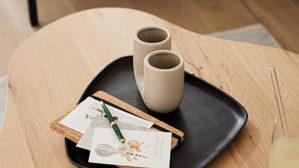 die furnierte, ca. 60 mm starke Tischplatte ist mit runden, schwarz lackierten Füßen aus Mangoholz kombiniert