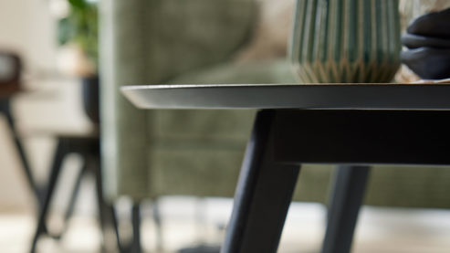 die furnierte Tischplatte wird von drei Massivholzfüßen getragen