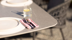 Die Tischplatte aus grauem gesintertem Stein (Sintered Stone) bietet nicht nur eine edle Optik, sondern überzeugt durch extreme Belastbarkeit. Kratzfest, stoßfest, UV- und farbbeständig sowie wetterfest – das Material ist wie gemacht für den dauerhaften Einsatz im Freien. Damit eignet sich der Gartentisch ideal für wechselnde Wetterbedingungen und intensive Nutzung.