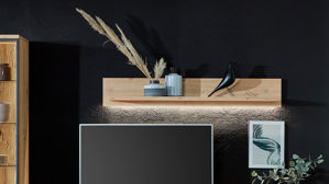 • Die Abbildung zeigt ein Wohnbeispiel, welches auch Dekoration enthält. Im Lieferumfang enthalten ein Wandregal ohne Beleuchtung.