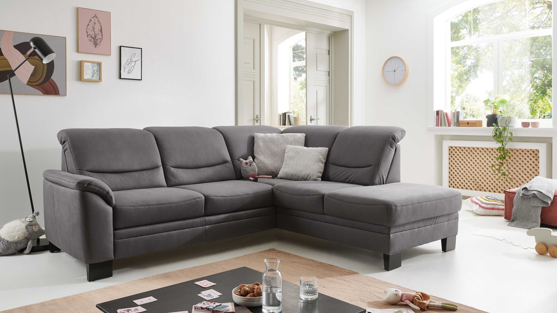 • Die Abbildung zeigt ein Wohnbeispiel, welches auch Dekoration sowie separat erhältliches Zubehör enthält. Im Lieferumfang enthalten ist ein Ecksofa ohne Extras.